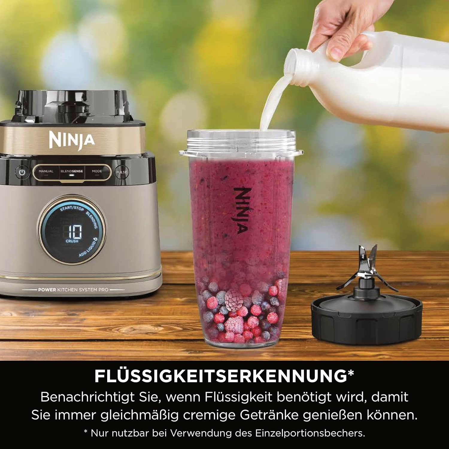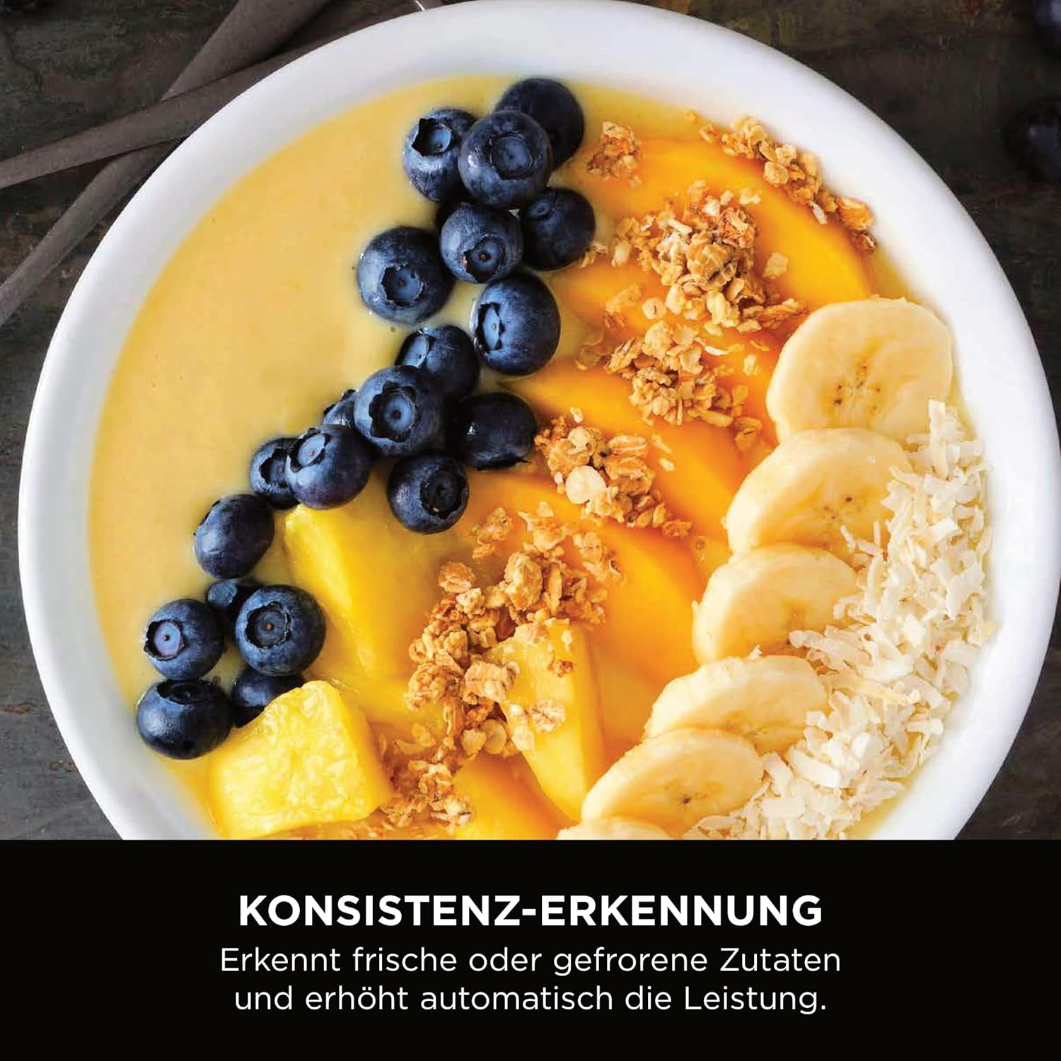 BlendSense-Technologie: Die intelligente Erkennung analysiert den Inhalt des Behälters und wählt automatisch die optimalen Einstellungen für glatte Ergebnisse, egal ob beim Zerkleinern von Eis oder Pürieren von weichen Früchten.