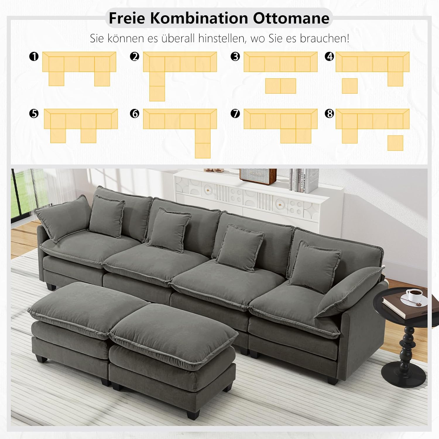 Flexibles Modul-System: Die zwei enthaltenen Ottomane sind frei beweglich. Gestalten Sie Ihr Sofa individuell als U-Form, L-Form oder mit separater Fußablage.