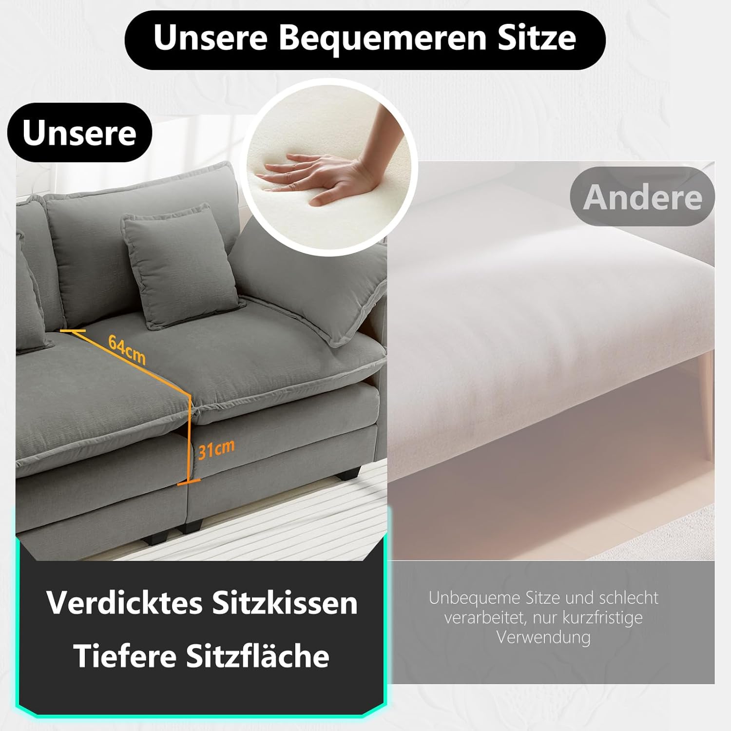 Die Sitzkissen bestehen aus einer doppelschichtigen Konstruktion: hochdichter, elastischer Schaumstoff trifft auf eine flauschige Polsterung. Mit einer beeindruckenden Dicke von 31 cm und einer Sitztiefe von 64 cm bietet das Sofa ein tiefes, einsinkendes Gefühl, ohne den Halt zu verlieren. Das ergonomische Design wird durch ein umfangreiches Kissen-Set ergänzt, das Ihren Rücken- und Lendenwirbelbereich optimal unterstützt.