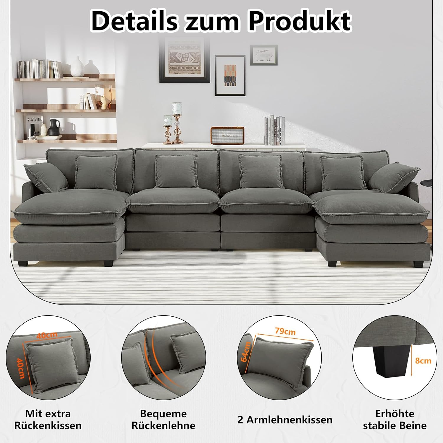 Das Urhanherry Cloud Sofa in U-Form definiert Entspannung in Ihrem Wohnzimmer neu. Mit seinem großzügigen Design und dem hochwertigen Chenille-Bezug bietet diese Wohnlandschaft Platz für bis zu 6 Personen. Ob für gemütliche Familienabende oder als stilvoller Mittelpunkt im Wohnzimmer – dieses Sofa kombiniert modernes Design mit unvergleichlicher Weichheit. Die zwei flexibel kombinierbaren Ottomane ermöglichen es Ihnen, die Form des Sofas jederzeit Ihren Bedürfnissen und Räumlichkeiten anzupassen.